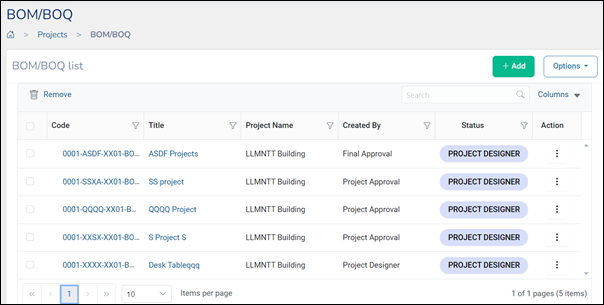 Note: The items displayed in the BOM/BOQ list can also be customized by selecting the columns drop-down menu. Search bar allows to search for a particular BOM/BOQ.
