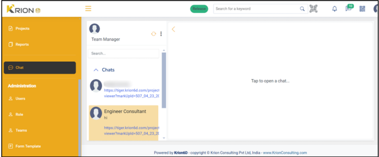 Chat tool in Krion 6D enables you to Chat with individual users or with a group of users. Clicking on the shows options to open existing Chat(s) or start a New Chat.