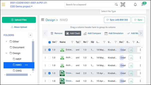 The .xml file and the .nwd file of the project should be already available under the same folder in the Documents section of a project. Select the required files and click on
