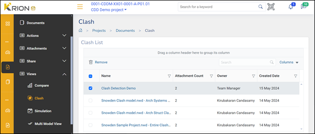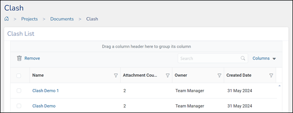Navigate to Views under Projects and Click on . The Clash List shows the list of documents created for Clash view.