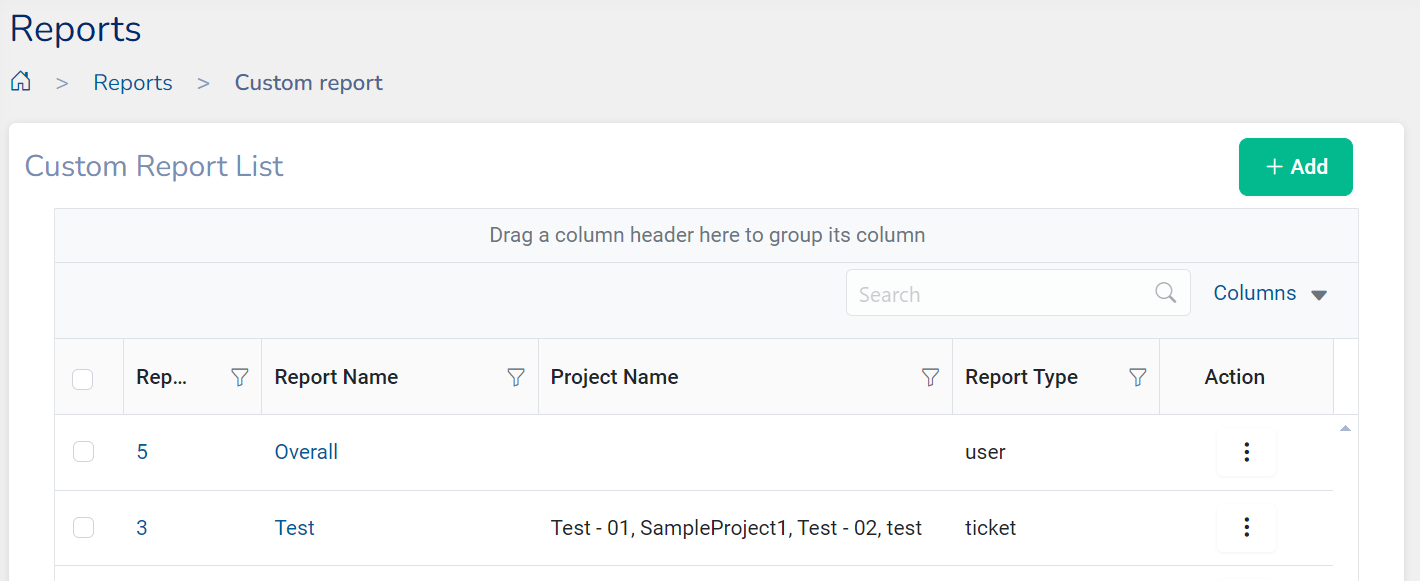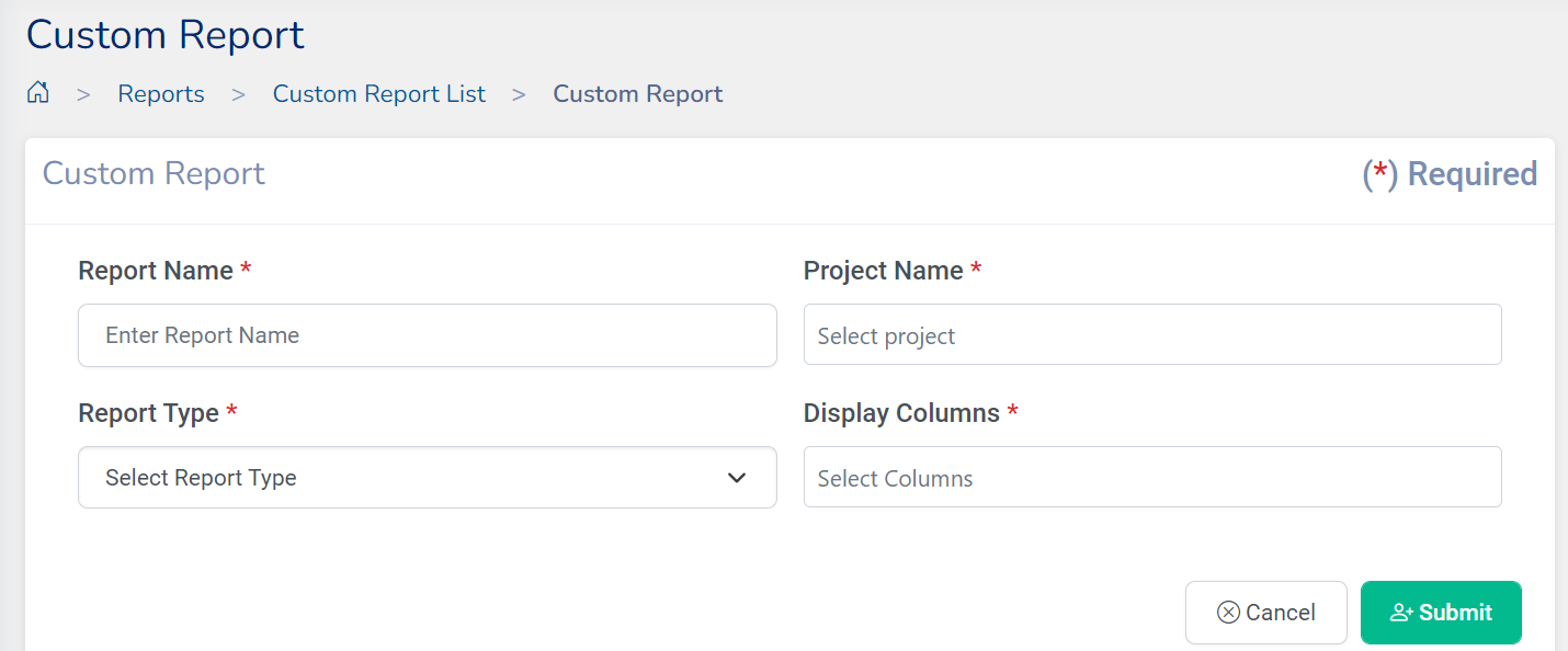 Custom Report tool lets you create customized reports to generate data relevant to your project. Custom Report can be accessed from the reports list