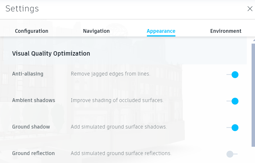o Appearance settings Modify the visual presentation of the model or drawing, including options for Shadows, rendering quality, and display settings to optimize visualization.