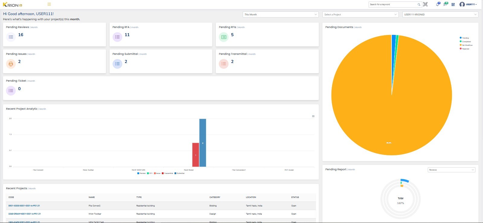 The main dashboard of Krion 6D serves as the central hub offering a comprehensive overview of key project aspects and displaying a single view of all your projects.