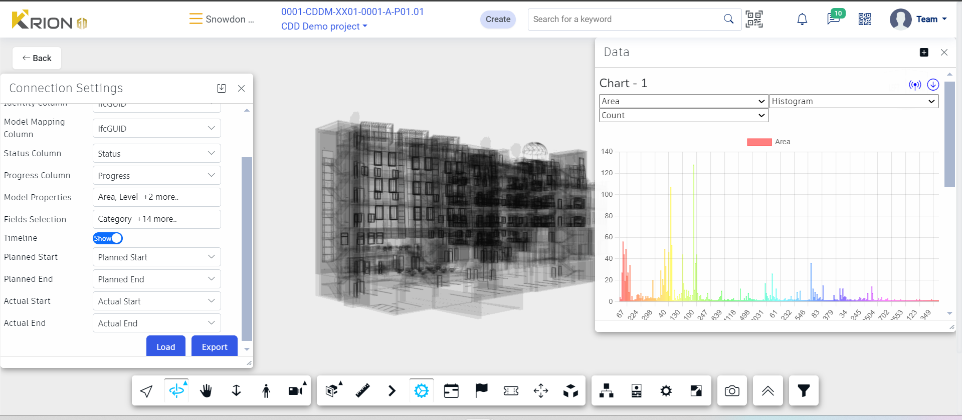 The IoT data connection feature in Krion 6D enables the analysis of all data related to the 3D structural model of a project. This tool allows users to connect any data in spreadsheets (XLS, CSV, DB) with the 3D model. The spreadsheet data is mapped through a unique ID, such as the IfcGUID. Once the data connection is established, users can use charts to slice and dice the data for further analysis.